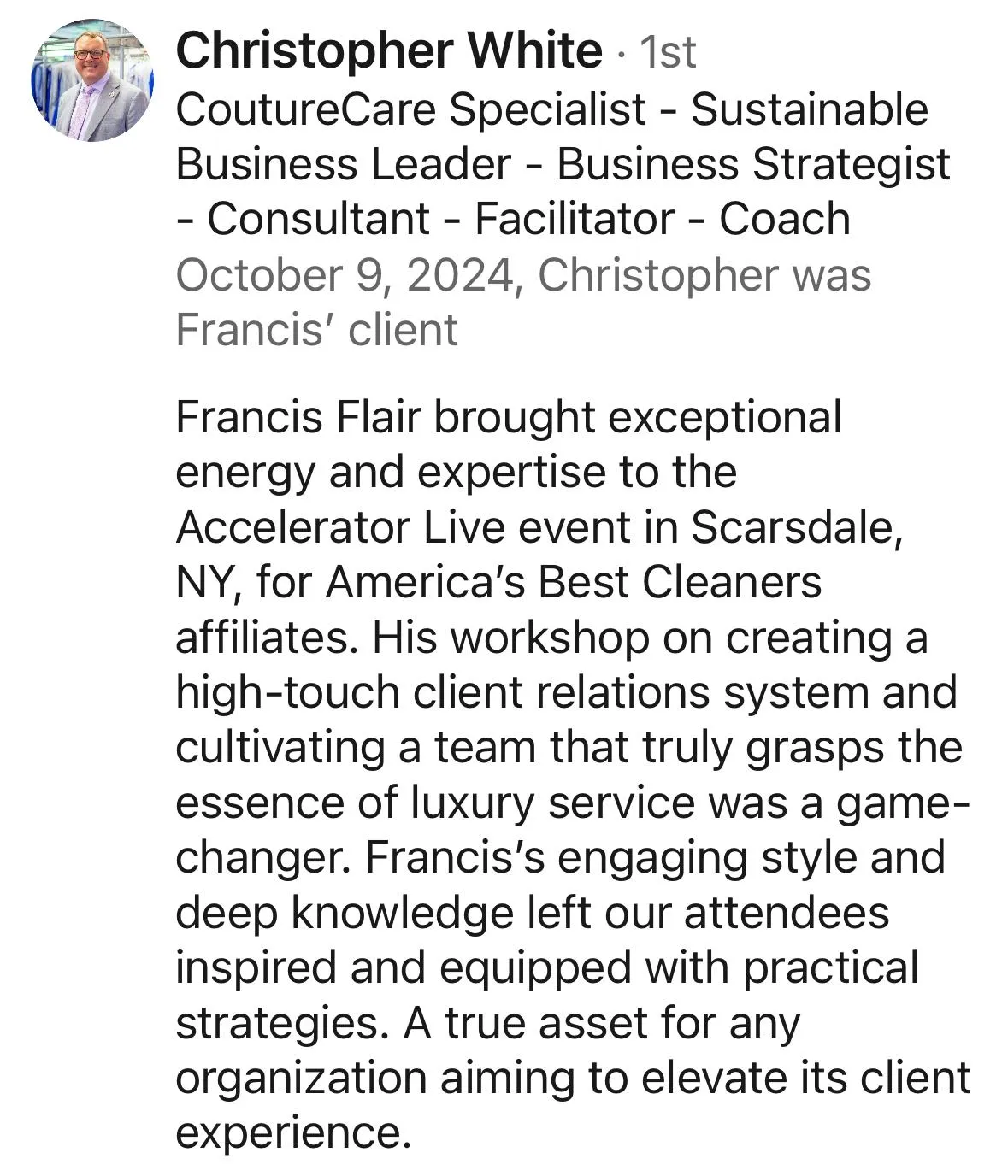 Some of the industries Francis has helped with the Client Retention System include, but are not limited to, Healthcare, Higher Education, Nonprofits, and Dry Cleaning.